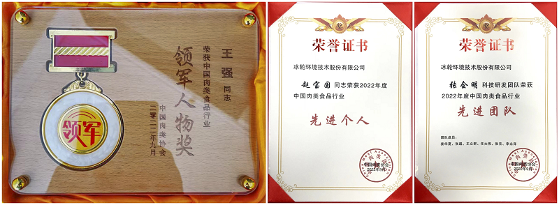 在本次肉类产业周上,冰轮环境原董事长于元波荣获“中国肉类产业终身成就奖”,党委副书记王强荣获“2022中国肉类食品行业领军人物”,党委副书记、总裁赵宝国荣获“2022中国肉类食品行业先进个人”,副总裁张会明牵头组成的“科技创新”团队荣获“2022中国肉类食品行业科研先进团队”。
