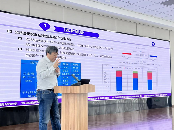 项目组负责人清华大学付林教授从项目背景、主要技术成果、所获得的知识产权、推广应用情况以及项目的社会经济效益等方面进行了总体汇报,北京清建能源技术有限公司张世钢教授级高工详细介绍了在青岛顺安热电有限公司建设的示范工程方案、设计、建设、运行、测试等情况。该项目引进华源泰盟与清华大学烟气消白余热深度回收新技术,发明了两段式喷淋梯级回收烟气余热的工艺流程,在前期提出的吸收式热泵烟气余热回收系统的基础上进一步利用电动压缩式热泵深度回收以潜热为主的烟气余热,实现最终排烟温度降至15℃以下。提出了烟气相变低温凝并原理,分别调整两段喷淋参数,烟气经过两次冷喷淋洗涤,达到了最佳的联合降污减排效果,实现了余热回收过程中的多污染物联合脱除,实测排烟中的各项污染物浓度均达到超低排放标准,可以完全代替湿式静电除尘器,降低了污染物超低排放治理成本。